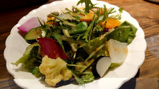 まず出てきた彩りサラダは、ロメインレタス、水菜の他にトマト、赤カブ、大根、かぼちゃ、ズッキーニ、ナスなどたくさんの種類の野菜が入っていて、柿も入っていました♪ よくあるランチセットについてるようなミニサラダの器より、2~3周り大きなお皿に盛られており、野菜をたっぷり食べられるのは魅力的!