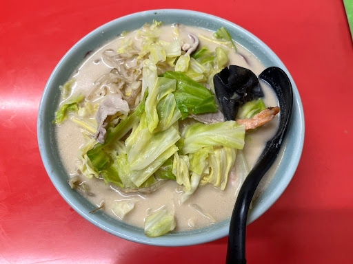 鉢がデカいです。ヴォリュームも申し分なし。 よくあるライト豚骨のスープでサラッとした口当たり。豚肉、野菜、海鮮、練り物と具材が多いせいか少々味が薄まっているような気がします。 卓上にラーメンタレを探しましたが用意されていないので、餃子のタレに用いるための醤油を使用。正直なところ、やっぱりこれは違うなと。 麺はコシと張りのある中細ストレート。チャンポン麺とはチョット違う感じですが、これはこれでアリでした。 食べ終えると丼鉢に違うお店のロゴが出てきてビックリ。それもまた哀愁。 いつまでも頑張ってほしいお店です。
