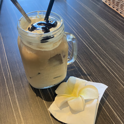 お店見た感じハワイアンなお店ですね〜 早速、店内へお邪魔ンボ(=゚ω゚)ノしますよ。 店内で待ち人ありで15分程待って席へ案内されましたよ。 おおっ( ◉ω◉ )なんじゃこの席は!? 大きな窓に大きな翼が書かれた壁。 大きなソファーがデデンッと置かれてます。 オサレな雰囲気にオッサン2人で浮いてますね(。-`ω´-)ンー メニューを確認( ᯣωᯣ )ジィーー ロコモコやめっちゃ具沢山なハンバーガーなどが有りましたが今回はお茶目的。 職場の先輩抹茶ラテ フロート780円 ワタクシ、コーヒーラテ フロート780円を注文 しばらく待っていると、、、