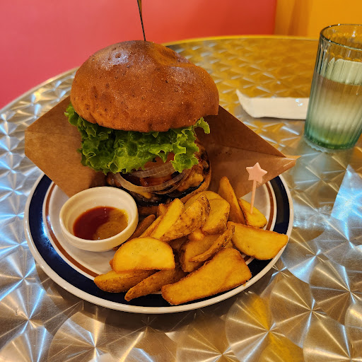 Right across from our hotel so we looked at the reviews, which prompted to try of course. Boyfriend and I are burger lovers and love to try burgers abroad when we travel. Atmosphere is nice and cozy- retro diner vibes. We came right at their opening time and the whole time we dined only 1 other table entered. Got the normal burger for both of us and a strawberry milkshake for myself.