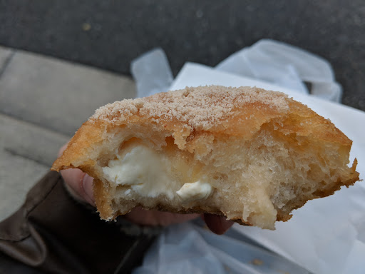 Note the layers and air pockets in the dough. This is a proper as heck pastry. It was hot since it came from a small, fresh batch. It was fluffy and cloud-like, but it held its shape well and wasn't messy. The cream cheese filling was the perfect temperature and consistency. I was nervous when I heard that was my flavor because I was expecting a giant block of dense cream cheese. Nope. The sugar on the outside also added the perfect level of sweetness to it without being at all overbearing.