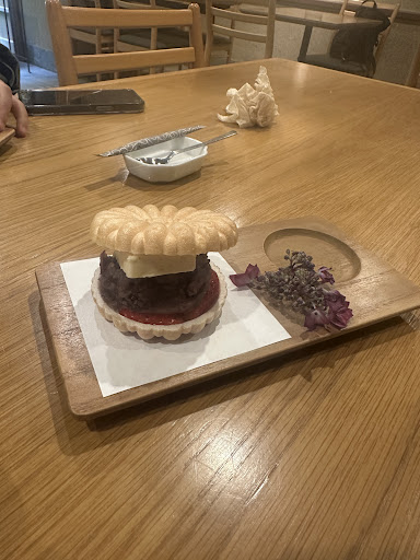 Stopped by the café next to the hotel for a quick afternoon tea. Since it was raining, the outdoor seating was closed. We ordered monaka with strawberry, red beans, and cheesecake. The dessert itself was just okay—nothing special.