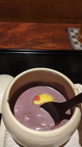 ◇黒米のおかゆ 定番となりつつある人気の逸品 黒豆をすり潰したペーストの中に、長芋や生麩が入っており、豊かな食感を愉しむことができます 素材からは考えつかないほど滑らかでとろりとしており、優しいお味です