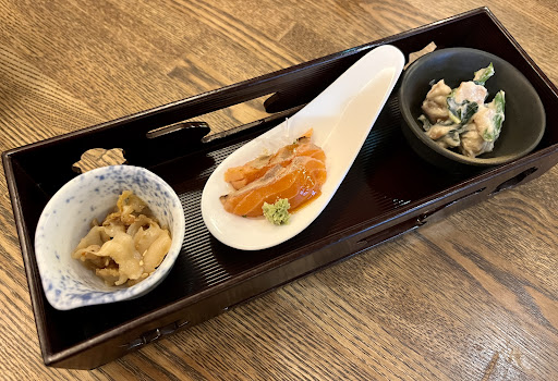 Located near the entrance of Fushimi Inari, Kanoko is an atmospheric restaurant with a traditional atmosphere offering a menu of udon and soba noodle dishes. First, we were started with an appetizer of three daily dishes: clams, raw salmon, and mixed persimmon and greens in a creamy dressing. The Nabeyaki set featured a clay pot of udon, shrimp tempura, egg, chicken, fish paste, shiitake mushroom, and roasted rice cake, all in a hot broth. The Sukinabe featured a pot of udon with tender, fatty slices of beef, egg, tofu, fishcake, and vegetables in a deeply savory, slightly sweet broth, served in an iron pot heated by a flame underneath. But my personal favorite item was the Tenzaru, a set which came with both buckwheat and matcha soba noodles served cold with a savory dipping sauce on the side, mixed with green onions and wasabi. The noodles had a pleasantly firm texture and went nicely with the plate of mixed tempura on the side, which included shrimp, fish, sweet potato, enoki mushrooms, shiso, and seaweed, along with grated radish and a light tempura sauce for dipping. The tempura had a nice crunchy texture without being greasy or heavy. Lastly, the set came with two pieces of Puchi-Inari, or seasoned rice wrapped with fried tofu skin (a fitting dish given the restaurant’s location). Overall, the food here was delicious and beautifully presented, and the traditional setting (which included tatami seating and an outdoor Japanese garden)...