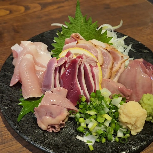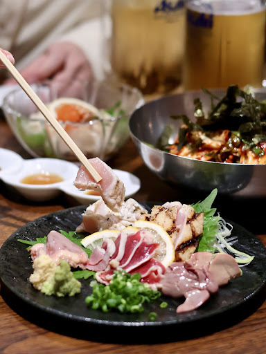 ⭐新鮮・朝引き鶏刺身盛り合わせ 鶏肉専門と云ったら先ずは刺身の盛り合わせですね!!! ももタタキ、ユッケ、砂ズリ、肝、ココロなどなど、新鮮なお刺身がずら~~り!!! わさびやごま油、ポン酢などなどでいただきましたのは、どれも美味しすぎます!!! 個人的には『もものタタキ』の食感が最高にGOODで無限に食べたいですね~~~