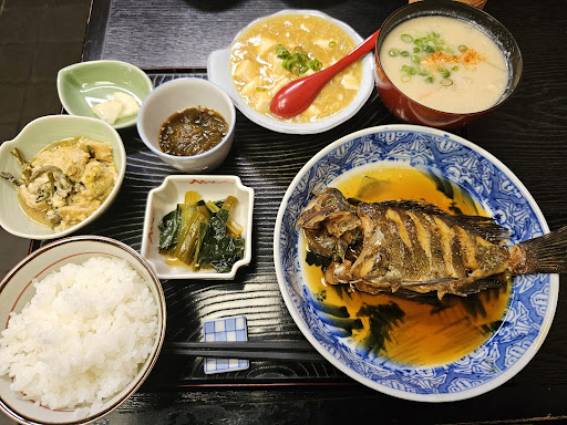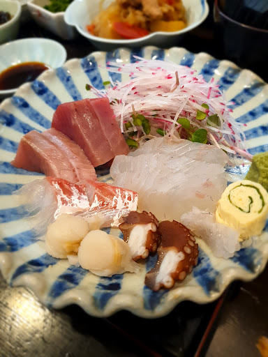 점심으로 방문했습니다. 점심의 정식은 늘 3가지로 고정인 듯한데, 메인 메뉴를 제외한 구성은 매일 달라지는 모양입니다. 저는 1000엔의 お造り定食(사시미 정식)을 먹었고, 사시미와 밥, 미소시루, 고기감자조림, 정체 모를 나물 2점이 나왔습니다. 단점과 장점이 명확한 가게입니다. 단점은 기본으로 나오는 밥 양이 꽤 적고, 리필하려면 100엔을 추가로 내야 한다는 점. 저는 여자고, 그렇게 많이 먹는 편도 아닙니다만 밥을 보는 순간 이건 리필할 수밖에 없는 양이라는 사실을 단번에 깨달았습니다. 그리고 가게가 좀처럼 발견하기 힘든 위치에 있다는 점. 장점은 당연히... 맛과 가성비죠! 요즘 세상에 1000엔 주고 이 정도로 풍부한 점심을 먹기란 어려운 일이니까요. 게다가 사시미의 맛도 훌륭하며 종류도 다양합니다. 밥 양은 적지만 사시미의 양만큼은 넉넉합니다. 신선하고 쫄깃하고 감칠맛 느껴지는 사시미가 먹어도 먹어도 줄어들지 않아! 최고! 이 정도 구성에 1000엔이라면 (밥을 리필한다면 1100엔이 되겠지만) 불만 없음 입니다. 여담으로 이곳의 미소시루의 맛이 특이합니다. 된장의 맛이 뭔가 옅고 독특한 풍미가 느껴졌어요. 주인 분들은 조용하지만 충분히 친절합니다. 여성 분 쪽은 계속 웃는 얼굴이었고, 차를 더 마시고 싶은지도 물어봐 주셨어요. 음식이 늦게 나온다는 말이 있던데 제 경우에는 10분 내로 나왔습니다. 1시 전후에 가면 여유롭게 즐길 수 있다고...