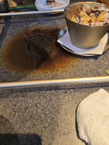Industrial-style stop for Korean BBQ meats with vegetables & sauces, self-cooked on tabletop grills.