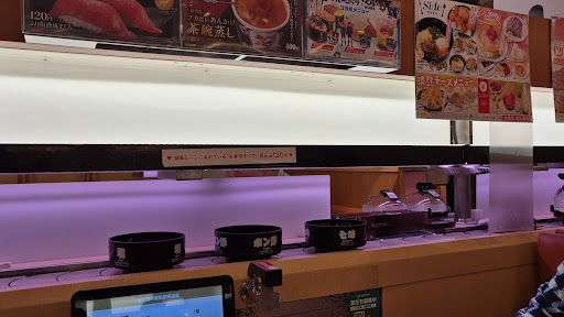 This place has had the freshest fish I've had so far, which was fantastic. Nothing here was previously frozen. All of the plates are flat rate 100 yen, which is great. More expensive items just have one piece on the plate, but for some reason, we couldn't get fatty tuna the two times we went, which was a big disappointment, and the only one really.