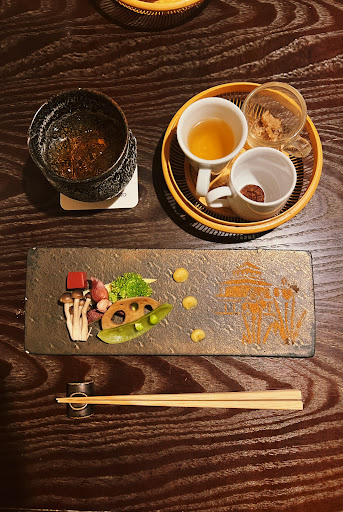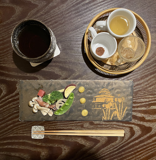 We received a warm welcome and were brought to a small private room. Our waitress was absolutely fantastic, she was very helpful & patient explaining what everything was and how to eat it! She advised us on what dishes and how many of each to order. We had an appetiser with different types of miso to try, with a beautiful powdered-miso design. Our main was honestly the highlight of our trip: traditional sukiyaki with beef & vegetables. It was such a great experience to be able to try some delicious authentic food as Irish tourists. Again, our waitress explained how everything worked extremely well and even had an English menu with some more familiar items. We had additional sides of rice & fried aubergine from this menu. The beer and plum wine were also delicious. We wrapped up the evening with some hot green tea. We felt so welcomed here & not intimidated at all as first-time travellers to Kyoto :)