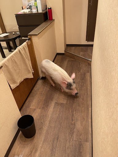We stored our belongings in a locker on the 1st floor and were escorted upstairs, given a blanket for our legs, and small area with cushions to sit on the floor. The piggies immediately flocked over and took to climbing in our lap or rubbing their chins on our feet. They enjoyed scratches and were content to trot around the area as they pleased!