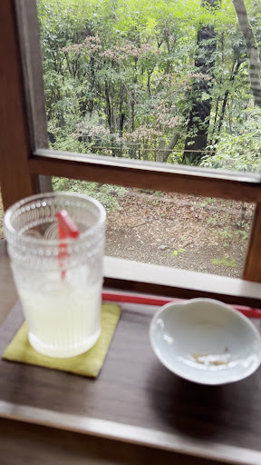 It’s a place where you come for experience, not eating/drinking. It’s a wooden house with panorama windows on all four walls, in the middle of woods, surrounded by trees and mountains. It’s a beautiful path that leads to this place. It’s so quiet and cozy inside, visitors respect each other and talk quiet. Relaxing atmosphere. You sit next to the window and enjoy nature. I was sitting next to the window and could see beautiful mountain landscape and even a piece of Kyoto city.