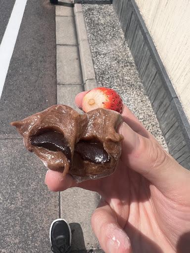 It was probably the best mochi I ever ate. Itâs super sweet and can stretch quite far when u take a bite. It also really sticks to your teeth so be careful if u smile at people while eating eat ;). Inside the mochi there is some kind of chocolate filling and on top of the mochi is the strawberry.
