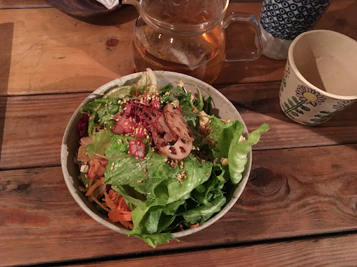 The best food we had in Japan during 4 weeks of travelling. Really nice couple that cooks fresh and with A LOT of vegetables!!! My husband and I found them on happycow when we searched for a vegetarian friendly restaurant in Kyoto (which is not easy at all, if you don't have a lot of money). Let me tell you, going there doesn't feel like a restaurant , it feels like visiting your aunt and uncle after a long time! They have a table outside, 2 japanese style tables and 2 normal tables, so the restaurant fits about up to 16 people at max, more likely 12. They have a really big vegetarian menu! The food is really awesome!!! Their specialty is Mon Pan (monguru pan/mongolian bread), which is a fried flatbread filled with a lot of salad, veggies and a few extra toppings your can order. You can also get sweet Mon Pan as a dessert, really good aswell!!! They have a lot of other dishes aswell, like yakisoba, budda bowl, stirfry and brown rice. We had such a good time there that we went there three times in four days! And the food was not expensive, what is really rare in Kyoto. We were really sad when we had to say goodbye to them on...