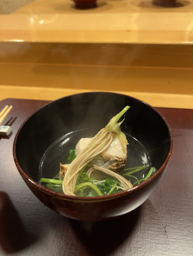 After seating at the counter, they quickly took our drink order, and the chef’s choice of courses started. One dish after another, every single item was delicious with both high quality ingredients and beautiful preparations. The food was so good, I forgot to take photos of most of the courses. Some examples included sweet sea bream, lightly seared (over charcoal) trout sashimi, grilled cutlassfish (which I have never had before and was amazing - it was also accompanied with the best tasting tomato I can recall eating), and spiny lobster soup. The meal ended with a sampling of sushi per our request, including ikura, some stunningly tender uni, wonderful isaki and kohada, as well as maguro, chutoro and salmon. Oh, and some very nice jellyfish and seaweed salad. Green tea service and a light dessert to finish.