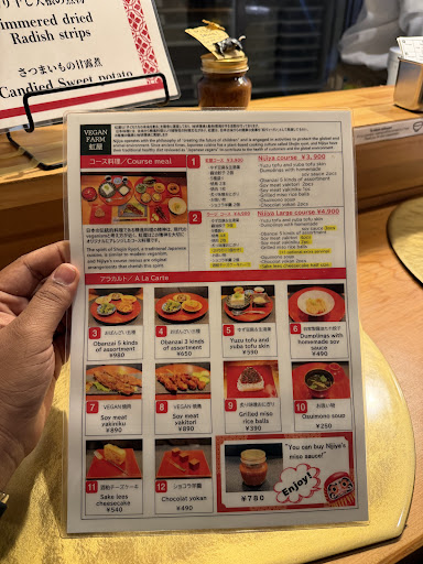 i went for the nijiya large course (¥4,900) and it was worth every yen. the set comes with yuzu tofu and yuba tofu skin, dumplings with homemade soy sauce, obanzai 5 kinds of assortment, soy meat yakitori, soy meat yakiniku, grilled miso rice balls, osuimono soup, chocolat yokan and a little sake lees cheesecake. it’s a full tour of vegan japanese flavors in one sitting.