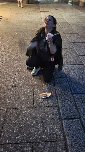 After a long hike up to the top of Fushimi Inari-taisha shrine, we were greated by the workers calling out "cheese beef." Naturally, we stopped. While they did try to upsell us into buying one more than we needed, it was the end of the night and I know they were trying to get rid of product. They were very friendly and chatty with us. As we were waiting for them to heat them up, my friend N. Said "daisuki cheese" a couple and made them laugh. Once we received the "cheese beef" N bit into it and immediately said "oishi!" She wasn't lying, they were great. As we were walking away, she fumbled and dropped it on the ground only after one bite! The workers were kind enough to bring her over and give her a new one for free! We were all laughing about the situation and when I showed them her picture, they were on the verge of tears!
