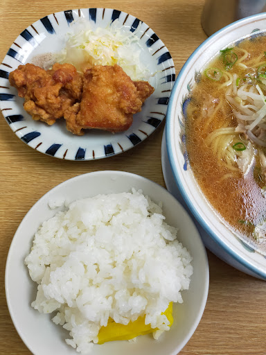 あと唐揚げも名物らしく、ウマい。 デカめの唐揚の衣はけっこう固めで、勢い良く頬張ると口内をケガしそう。 柔らかい唐揚げが好きな人には向かないでしょう。 でもコレがウマいんですよ。 実際、お客さんの殆どは唐揚げ、ラーメン、ライスのAセットを注文しているようでした。