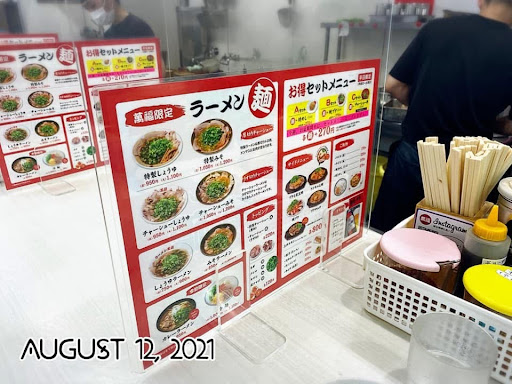 店内へ入ると正面にレジがあって、オレは同じカウンターのすぐ横に座った。 するとレジを担当していた女性店員(30〜40代?)がオレの前に来て、いきなり「これをこのまま見てもらえます?」と言いながらメニューが貼り付けてあるアクリルの仕切り板(写真1)をオレの方へ向けた。