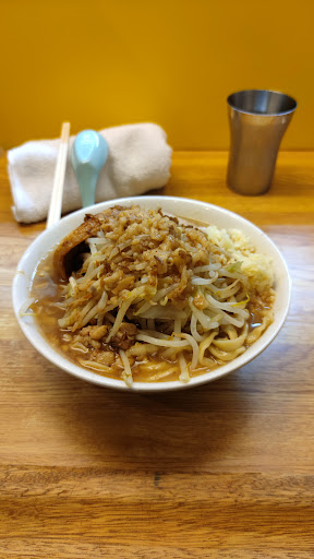 The ramen is actually a Jiro-style ramen, but differs slightly, as their shoyu soup base is actually a bit stronger than others, with chunkier bits of pork fat in the soup. The sprouts are piled high, the noodles thick, chewy, and flat, and the chashu chunky and thick… certainly savory and extremely delicious. I also highly recommend the flavored egg, as it was really soft, perfectly cooked, and surprisingly delicious.