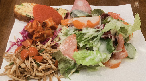 前菜盛合わせがお皿一杯に登場 サラダにオムレツ 柔らかくてピリッとするトマト味のイカ さいたチキンと韮の和えた物 巻いたハムにはスパイスの効いたポテサラ
