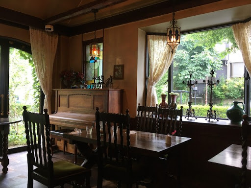 山科区民になくなてはならない、1976年創業で間もなく45年を迎える、英国風の洋館をモチーフとした昔ながらの喫茶店です。 店内は、アンティークな家具類が揃い、冬は実際に使われる暖炉、ステンドグラス、お庭のテラス席にはたくさんの花が咲き乱れ、テラス席ではペットの同伴も可能です。店内はテーブル席が50席ほど、テラス席が20席ほどあります。休日はもちろん、平日でも賑わっていますが、回転がよく待たされることはありません。 平日限定の日替りランチはコーヒーが付いて \1,200-。コーヒーは \550-、価格帯は高めですが、手の込んだお料理を提供いただけます。一番のウリは、自家製ローストビーフ。これを生かしたサンドウィッチもあります。その他、カレー、ハンバーグ、シチューの他、\3,000-...