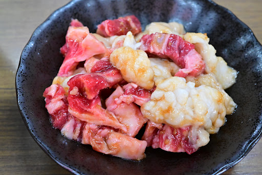 豚トロとカルビを焼いていく 肉は値段のわりに悪くなく、柔らかい 豚とろもカルビも脂が落ちて良い具合 ここはたれが美味しいね 1960年創業時から伝授された秘伝の味噌たれで、お酒に合うように濃い目だそう オン・ザ・ライスして食べるとご飯が止まらなくなります