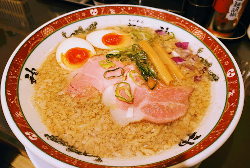 Read more四条大宮にある「セアブラノ神」の支店です。改札口を出て、右手の北側方向に進みます。駅前の道の交通量が多く、反対側の見通しがよくないので駅側からだとお店の場所がわかりませんでしたが、道路を横断し右に少し進むと、歩道橋の先にY字の路地があり、すぐにお店を見つけることができました。 平日の夜に訪問しました。店内は8割ほどお客さんが入っていました。入口側にカウンター席が並んでいて、奥には座敷の席があります。食券制で、入り口すぐのカウンターの上に券売機がありました。 味玉背脂煮干しそばをお願いしました。メニューはラーメンの他に、つけ麺やまぜそばも人気のようでした。ラーメン注文時に麺の量を並か中盛か、麺の種類を太麺か中太麺か選ぶことができました。並、太麺でお願いしました。 京都の昔ながらの背脂系のラーメンは「背脂」&「醤油」の味が多いと思いますが、こちらは「背脂」&「煮干し」の組み合わせが特徴的です。とてもバランスのとれた美味しいラーメンでした。 スープは背脂の旨味と、煮干しの深い味わいです。もちもちとした食感の太麺の味も美味しかったです。チャーシューは薄く大きく柔らかく食べやすい美味しさでした。さらに食べ進めると、具材のみじん切りの生の玉ねぎの辛みがいいアクセントになっていました。完食後に胃もたれするようなこともなく、背脂の質がよかったのかなと思いました。本店も訪問し...