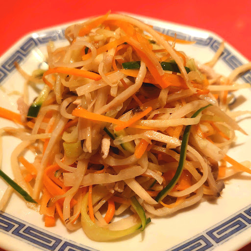 まずは前菜として、女将さん一推しの「八宝絲(はっぽうし)」をビールと共にいただくことに。 これ聞いたことのない料理だが、簡単に言うと冷やした野菜炒めという感じかな。 細切りにした豚肉、筍、椎茸、人参、白ネギ、生姜などをさっぱりと炒めた冷菜で、ビールのつまみにピッタリだ。この一皿で軽く中ビン1本は空いちゃうな。