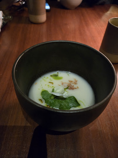 Read moreMy friends and I ordered set menus: I got the plant-based, and they got the meat. I will only comment on the meal I ate as I cannot speak to the taste of the meat dishes. Firstly, my appetizer was a tomato with some pickled onions and sauce. While it was tasty, I wasn't blown away as the main flavor was raw tomato. The next course was a cold potato soup, which was similarly OK. I've had better potage soup. The next course was a green risotto, which, while decent, was also just OK for me. I wanted an extra complexity of the flavour that I thought just wasn't quite there. The next course was my favorite: the grilled vegetables with what tasted like a sesame mousse. It was very good, especially the bamboo shoot. The dessert was a bit disappointing: strawberries in a white sauce that had a certain odd grittiness to it. We also tried the sake tasting flight, which was very good. The service was friendly, but we were asked by different servers whether or not we had gotten our next course or next sake tasting, which indicated a bit of disorganization. The ambiance was great. We were seated by the window with a view of the trees outside, and the lighting was very...