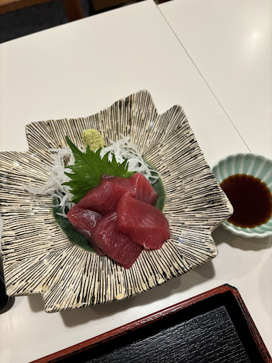 Udon noodles served with toppings & dipping sauces in a small, busy publike space.