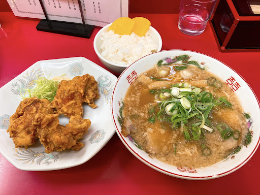 I always order the ramen and fried chicken set. I like my noodles cooked firm and topped with plenty of green onions. When ordering ramen, just say "Men Katame Negi Ohme" to the owner, and they'll understand. The soup, noodles, and green onions are all delicious. Their dedication to using Kujyo green onions from procurement to preparation is impressive. The soup is light on saltiness, just right. The fried chicken is fried in lard, aromatic and crispy delicious.