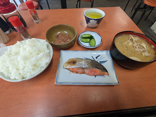 既に食欲は失せてましたが豚汁とご飯小をオーダー。 ーーー(ここから食レポ)ーーー ご飯小はやや大きめの茶碗にしっかり一杯。 豚汁は恐ろしく豚沢山。 豆腐一欠片とタマネギ数片あったけど後は椀を埋め尽くす量の豚。 超アツアツ。 ミソがかなり濃い。煮詰まってるのかな? ほぼ肉(豚)しか入ってない。 そういうのが好みの人はいいでしょうが、もっと野菜色々入ってる家庭で作る豚汁の方がきっと美味しい。 ーーー(食レポここまで)ーーー