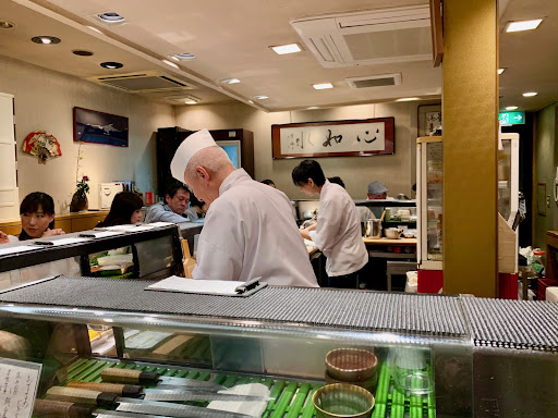 Delicious sushi in a friendly and relaxed environment. This quiet little slice of heaven was the best sushi that we had during our 4 week stay in Japan. When we walked in we were a little intimidated by our lack of Japanese and the very local feel of the restaurant; local businessmen and families made up the other customers. We were motioned to wait on two of the smallest stools I've ever sat on (I'm only 1.84cm so not huge but I felt like a giant) next to the till and wait until there was a space at the counter. After only a 5 minute wait we were given our space but we were lucky with the timing because no other seats became available during the next 1.5 hours.