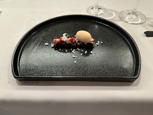 Menuは、①アミューズ(福井県敦賀産囀子蟹コンソメ・カリフラワー) ②前菜3品(※福井県敦賀産アオリイカマスクードシード・コリアンダー・玉急・禁・ケール※舞鶴産天然本鮪タブナード•あやめ雪・九条息・クルトン・アスパラ菜※大原の野菜ピタミン大根・黒大根・紅化粧・紅くるり・紅心大根・紫大根・サラダかぶ•もものすけ鎮杏・濤老芋・スナップエンドウ・わさび菜) ③魚(三重県答志島産とろさわらプロッコリー・椎茸・きくらげ・柚子・酒粕大吟醸) ④口直し(冷たいジャスミンティー) ⑤にぎり(三重県答志島産とろさわら・カマルグの塩・わさび•生姜・急) ⑥肉(鳥取県産万葉牛しんしんプチヴェール・芽キャペツ・万願寺唐辛子・完熟万願寺唐辛子・ごま油・ジュのソース) ⑦ごはん(滋賀県産有機栽培米「夢ごこち」「こしひかり」ちりめん山椒) ⑧チーズ(フロマージュ~プルードオーペルニュ・オヴァリーサンドレ・シャウルス・プリードモー) ⑨デザート2品(※ヨーグルト※長野県小布施産和栗クレムシャンティ・カカオ・フランポワーズ・焼きメレンゲ・棗楽第 ⑩カフェとミニャルディーズ(プルガリア産ダマスクローズのマカロンクリームチーズとフランポワ...