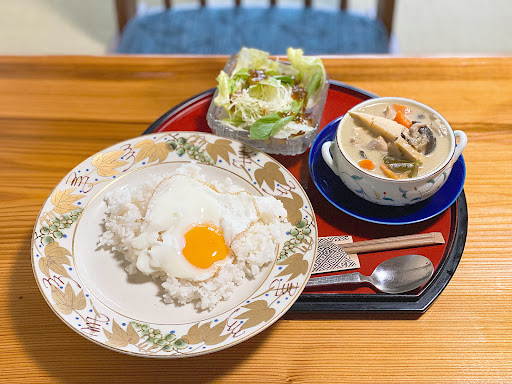 ドリンクやお菓子などの喫茶メニューに、カレー、京風カレーうどんが用意されていて、ランチ利用もできる。タイカレーを食べたが、いい感じの辛さがおいしく、野菜がたっぷりで食べごたえがあった。目玉焼きが辛さを中和してくれて、ナイスな存在だった。