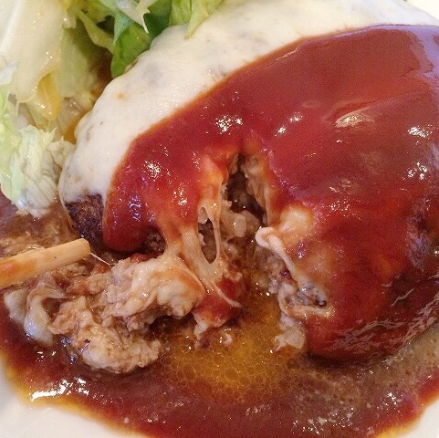 ・チーズハンバーグ チーズハンバーグ(300g)。なかなかのド迫力です。ソースはオリジナルでトマト強めの酸味の効いたケチャップ&ウスターのような味で、これもどストライクです。ハンバーグのほかにご飯、みそ汁、漬物がセットになっています。ご飯とみそ汁はパンとスープに変更OK。(ご飯大盛りは+50円でできますが、ホント山盛りできますからご注意を)サラダもたくさんついてきます。味はいたってフツー。でもハンバーグの箸休めとしては十分です。