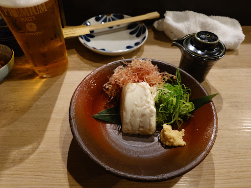 Cheap ingredients, and super boring food altogether: The appetizer is just tofu, bonito flake and shredded shallot. What a start. Salad is just small veggie sticks from Lawson, with salad and seaweed. Should add some fried shallot. Rolled egg omelette in a bland soup. Maybe some Yuzu or Ponzu sauce added would be interesting Yakitori skewers are just dry, and with plain salt. There's not even chili powder on the table to make them taste more interesting. Whatever special skewer it is, it didn't taste special to me. That egg yolk didn't do anything to make it better. A simple honey & worcestershire sauce mixed together and glazed on top would have made it more special than what I was served with. Then I got half of a grilled onion with some soy sauce. What!!?? The final dish was the classic Japanese egg porridge. Bland. For real eating 11 different onigiri and sandwiches from Family Mart would have been...