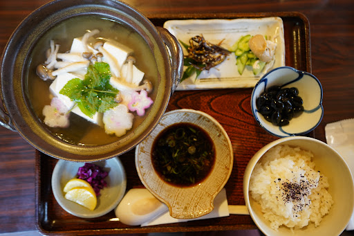 We found this place after visiting some sites in the area. It has several tables inside and a sweet lady greeted us and directed us to a table. I was excited because I wanted to try boiled tofu and it was on the menu. We ended up ordering rice in green tea (because it sounded interesting!) and the boiled tofu set. The food was excellent. The tofu comes in a hot pot and with a side of delicious sauce that you can dip it in. It's hot and warm and silky. It tastes very fresh and is absolutely delicious with some of the sauce. The other pickled items and rice are also nice. And there's even some big sweetened red beans that are almost like a nice dessert after. We also enjoyed the green tea rice.