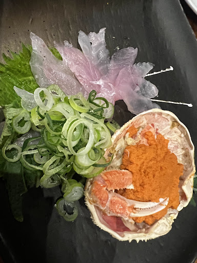 Now onto the food: every dish was tasty and I ordered a lot (ajillo even though they use toast here instead of a baguette, chicken and green onions, ebi fried, fried cheese bits, hamburg, and raw crab sashimi). I highly recommend the chicken and green onion even though it’s a simple dish, they executed it really well. The taste of the green onion was highlighted by the ponzu radish sauce they provided.
