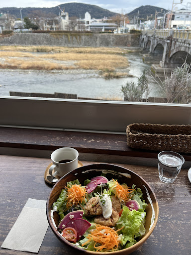 Read moreThis place was was recommended to me by Asako (one of the yoga teachers at Tamisa yoga studio in the Sanjo district) when I asked her about vegetarian options in Kyoto. I finally managed to get there for lunch on my last day in Kyoto and was very impressed. Lovely location by the riverside means you can enjoy your meal overlooking the river ( the day I was there I saw a heron, a hawk and plenty of other bird life while I enjoyed my meal). The place has a lovely vibe and had great music playing when I was there. Very friendly helpful service and the food is exceptional. I had the salad bowl which comes with a small side of soup, a blueberry smoothie and a soya flat white. All were made to perfection and full of flavour. Would definitely go here again next time I’m in Kyoto. Also highly recommend their sister cafe at the Sanjo yoga studio which does fantastic smoothies and incredible muffins....