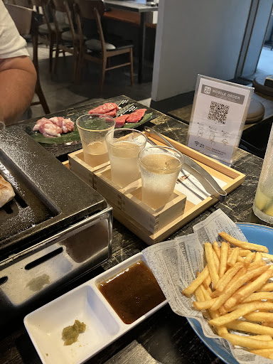 Read moreReally great food. The Sake tasting was well worth it. We had a selection of beef and chicken + the mixed vegetables- all grilled at the table by us. My son got the cheese sausages and fries and they were also very good (and he could grill his sausages, too). We had desserts (crĂšme brĂ»lĂ©e and waffle with ice cream) both really good! Very family friendly. You order via a QR code from your phone at the table (free WiFi available if you donât have mobile data). They had an English menu and the phone app was also dual language and had pictures of the food. It was super easy to order (especially helpful as after 2 weeks of using our terrible Japanese language skills and pantomime, eating out was becoming a bit stressful.). This restaurant has it all - good food, easy to order and it was just fun! Highly recommend!! Best part we reserved via google which made it...