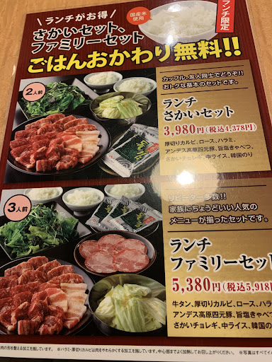 Read more別の店舗によく行くのですが、こちらは初めて来店しました。 席に着いてメニューを開く間もなくドリンクを聞かれたのでとりあえずあるだろうと思ったコーラを注文したところ、 『コーラはあちらにあります』とドリンクバーの方を示されて、一瞬どういう事なのか分からなかったが、メニューを開いて理解しました。ソフトドリンクはほとんどがドリンクバーになるそうです。よく行く店舗では単品注文ができるので困惑してしまいました。 私がメニューを開いてシステムを理解するのをそばで待っているなら、店員さんが一言説明してくれた方が早いのになぁと思いました、、、 お肉はもちろんお肉以外のメニューも好きなのでさかいはよく利用します! チョレギサラダとデ...