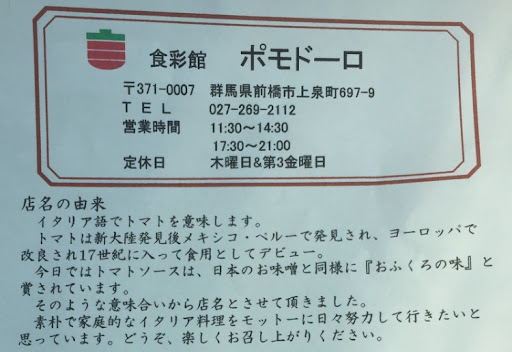 Read more真心こもった料理とアットホームな感じでとてもおすすめです。 しかし、お店の看板に書いてある休業日以外に行っても閉まっているときが多く、ご高齢だし、お店の方の体調によるのかなぁ、、、と思いました。それと、Googleマップでは17時半から開店、とありますが、実際は18時からです。近くを通って、空いていたらラッキーで寄りましょう、というくらいの覚悟が良いのかもしれません。 それと、参考までに、県道3号(前橋大間々桐生線)は夕方めちゃくちゃ混みます。ポモドーロ前から南下して県道3号線を右折するのは信号を複数回待つの覚悟ですので混雑時間はさけた...