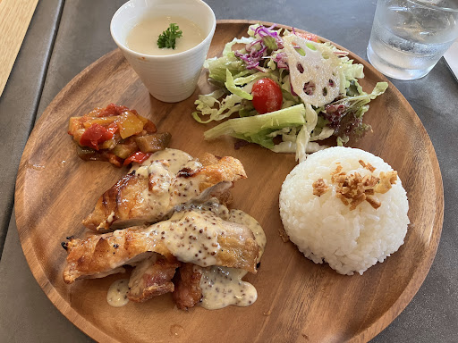 チキンのプレート(ハニーマスタード)を頼みました。 チキンの皮がパリパリでした。 同行者はハンバーグを頼んでいましたが、火入れがちょうどよいと言ってました。 サラダ、ラタトゥユ、じゃがいもの冷静ポタージュ。 全体的にクセのない優しい味付けでした。