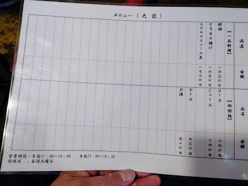 Read more一度来てみたかった街中華です。平日のランチタイムに来ました。なかなか年期の入ったお店で老夫婦が営んでいます。小手調べでチャーハンと餃子をオーダー。店内は他の客もなく貸切状態です。程なくして提供されました。まず、チャーハン、餃子とも量は少なめ、小ぶりといったところ。味は王道街中華の優しい味付けです。あっという間に完食!。若い方々にはちょっと物足りないかもですね。メニューが結構バラエティに富んでいるので次回...