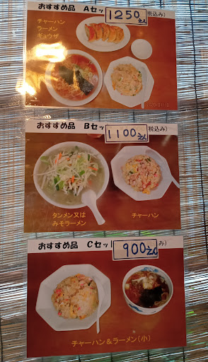 Read moreこれぞ町中華という面構えのお店。初訪問でドアが固く、営業中に閉店?と思わせるような頑固な固いスライドドア。思わずピンポンを押してしまいました。なんとか入店し悩んだ挙句、Bのチャーハン、タンメンセットを注文。料理が出来る合間に、女将さんと談話。 10分くらいでチャーハンから着丼です。 味はしっかりしっとりの塩味もちょうど良い最高のチャーハン。グリーンピースは嫌いな人が多いからと、代わりにきゅうりの千切りがアクセント。これがまたシャキッと良い。 続いて3分後にタンメンが着丼。見た目から野菜がどっさり。麺は少し縮れた中太麺。塩辛くなく優しい味のごま油の効いた最高のスープ。今の若い人に食べてもらいたい、これこそ昭和の町中華のタンメンでした。その後、マスターと女将さんとカラオケの話しで盛り上がり、食事10分、話し40分くらいだったでしょうか。本当に最高のご夫婦でリピーターは確実となりました。 儲けよりお客様を大切にする本当に最高なご夫婦でした。これから通いたいと思いま...