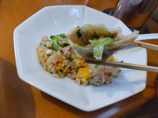 チャーハンは、ややしっとり系、味はちょうど良い塩梅で、ネギの代わりにキュウリが入っているからか、あっさりしていて食べやすかったです。😋 具は、刻んだチャーシュー、ハム、キュウリ、ナルト、玉子が入っています。 肉類が2種類と、キュウリが入っているのは、珍しいと思います。🤩