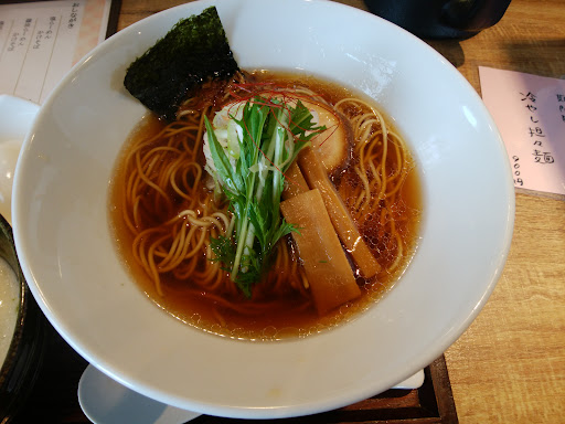 仕事で当地を訪れた際にランチ利用。日曜の13時少し前の訪問で空き席半分くらいの客入り。どの駅よりも離れているのにさすがの人気店のよう。 この日は醤油らーめん+煮玉子+日替わりご飯を食す。780円+100円+250円也。日替わりご飯は鶏肉とろろご飯。 らーめんのスープは昆布や鰹節出汁でしょうか?極めて和風な風味で醤油味も極めて控えめ。麺は全粒粉入りの中細ストレートでラーメンの麺と言うよりお蕎麦的。具材はバラチャーシュー1枚に太目短めのメンマ3本くらい、それに水菜。煮玉子は半熟通りこして黄身は生に近いくらいのトロトロ感。 お店はカウンター5席程度にテーブル席多数で、おしゃれな小料理や風で、程よい広さで清潔感も抜群。 お店の前に4台分ほどの駐車場もあり。 接客応対もすこぶる感じ良い。総じて極めて良いお店です。