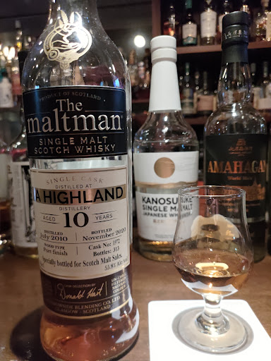 さて次は、等という時にシガーカクテルなんてのも、見かけなくなりましたねえなんて話をしつつ、実はラムにいい印象がないという話をしたところ、本来マスターの想定していた流れから離れての提供 ラム酒 ロックスタイル ※マスターには、配信の方で「ゴッドファーザーが好きで飲んでいるんですよ」なんて事を何度かお話しさせていただいているので、決して無確認で強い酒を出してるわけではないですよ! と、とりあえず名誉の為に注釈を差し込ませて頂いて 2杯目 ベネズエラのプレミアム ラム 「ディプロマティコ」 実は、これが印象としては一番強かったりします と、いうのも1杯目、3杯目は「見た目も名前もおおよその味も」配信で聞いていたので「思ったとおり美味しい」だったのです しかし、私はラムにいいイメージがないのです バカルディもマイヤーズも、どちらも合わずに「俺とは相性の悪い種別」とそこから手が伸びる事の無かったお酒でした マイナス評価からの高評価という振り幅で、印象値としては一番高くなりました それは、確かにこのお酒が美味しかったというのもあります むしろ、それよりも… 「普段客の飲んでいる系統」の少ないデータと、自身の知識から「これなら美味しいと飲んでもらえる」というお酒を導けるプロの技と言うべきコンシェルジュ能力を体感したからです この時に「飲みたいものを頼む形式なら出会うことがなかった」との思いから、ユメマスターを信頼して「すべてを任せる」という決断に間違いがなかった事を実感しました。 ラムの味については、うん、語れるほどわかんね、うめえ そして最後 3杯目 紫芋と焼き芋のスイーツカクテル