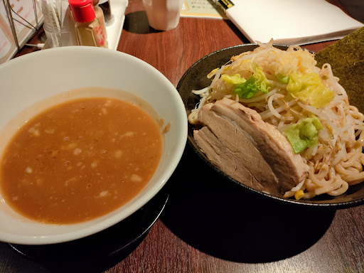 気になっていた「濃厚ドロつけ麺」を食べてみた! まず驚いたのはそのつけ汁。二郎系ラーメンのスープそのままか……と思いきや濃厚に香る魚介の風味。まさかとは思ったが、これは「二郎」と「魚介系つけ麺」の融合なのである。 加えてメニューの中に気になる表示を見つけた。それは「替えスープ+150円」である。「まさかそんな注文する必要あるか?」と高をくくっていたが、そのまさかである。 何故ならこのつけ汁、麺にからむからむ!まさに「ドロッ」としたつけ汁なのである。丼いっぱいに運ばれてきたはずのつけ汁がみるみるうちに無くなってしまった!まさにつけ麺としては、この麺と汁のからみ方は究極なのではないだろうか? さて、褒めるだけ褒めたが、悪い点もある。まず「二郎」と「魚介つけ麺」の融合と書いたが、それがそこまで美味しくはないことだ。次につけ麺なのに「熱盛」がないこと。これはもしかするとオーダーすればできるかもしれないので要検証である。最後に接客に熱意がないこと。店内は広く、人が少なければどこかガランとしている。そこには「二郎系」を食べるという熱意が致命的に欠...